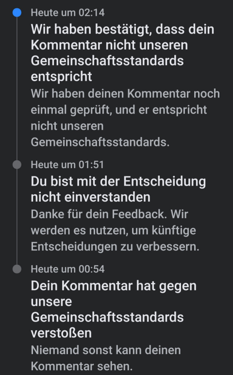 Die Uhrzeit lesen können die Algorithmen auch nicht. Oder wird mir als deutschem Nutzer die US-amerikanische Zeit angezeigt? Mein Widerspruch gegen die Sperrung erfolgte nicht um 01.51 Uhr sondern um 11.29 Uhr.